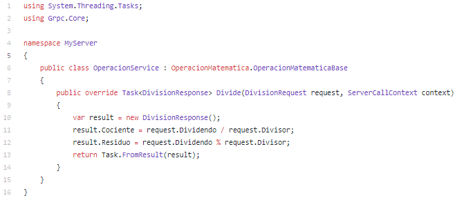 Continuamos dándole implementación al contrato (recuerden que debemos compilar el proyecto para poder generar las clases bases a implementar), que en este caso expone un único método llamado Divide el cual recibe como parámetro un mensaje de tipo DivisionRequest y retorna un mensaje de tipo DivisionResponse. Estos mensajes se deben “traducir” a tipos usados en C# y estan disponibles una vez compiles el proyecto.