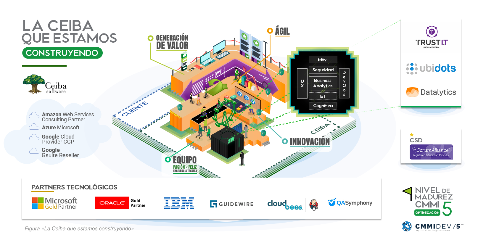 Decidimos antes de continuar con aliados externos, fomentar alianzas internas. Por lo anterior, en el 2011 decidimos adaptar nuestra forma de trabajo a las metodologías ágiles, lo que nos permitía entregarle valor continuamente a nuestros clientes; complementamos el servicio con áreas como el Estudio de Innovación y Diseño (Diseño centrado en usuarios); y desde la Gerencia Técnica creamos y fortalecimos el área móvil, cognitiva y DevOps. Es así como venimos modelando continuamente “La Ceiba que estamos construyendo”.