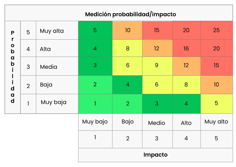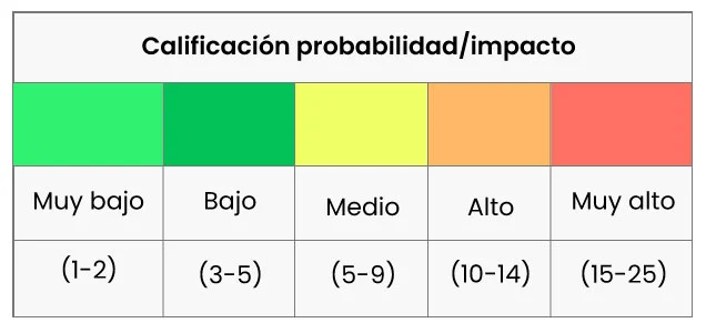 Una vez calificadas la probabilidad y el impacto, dichos niveles se multiplican para clasificar el riesgo inherente en un nivel muy bajo, bajo, medio, alto o muy alto, de acuerdo a la siguiente tabla: